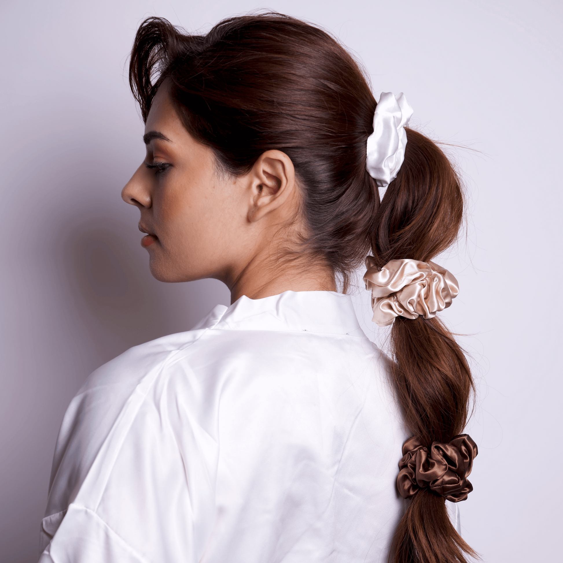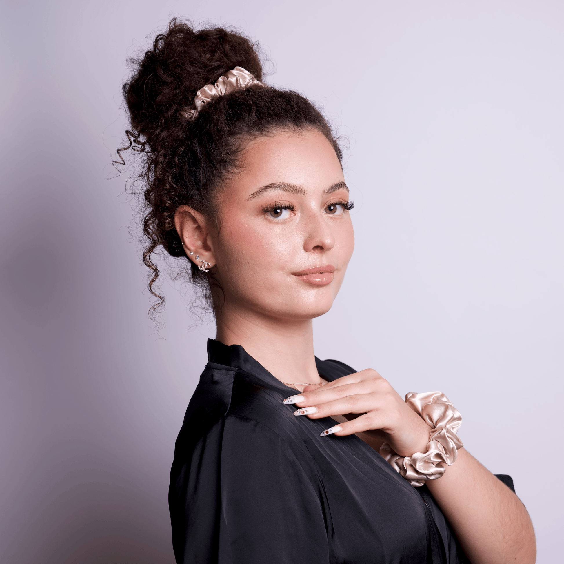 Unsere Moone Haargummis aus reiner Maulbeerseide helfen Ihrer Kopfhaut, feucht zu bleiben, und schaffen so eine Schutzbarriere, die die Wirkung Ihrer Haarpflege maximiert.